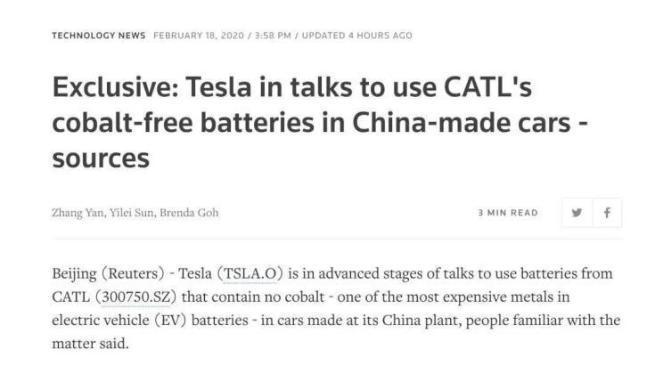 2020年,疫情還沒(méi)完全結(jié)束的時(shí)候,有媒體稱特斯拉將使用寧德時(shí)代的“無(wú)鈷電池”,有趣的是,“無(wú)鈷電池”既可以理解為三元鋰電池去鈷,也能“曲解”成磷酸鐵鋰電池這種本來(lái)就不含鈷的電池,只能說(shuō)報(bào)道的媒體太會(huì)玩文字游戲。