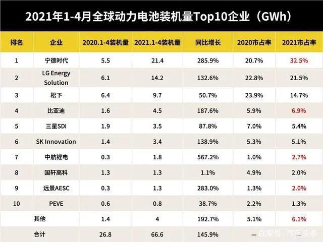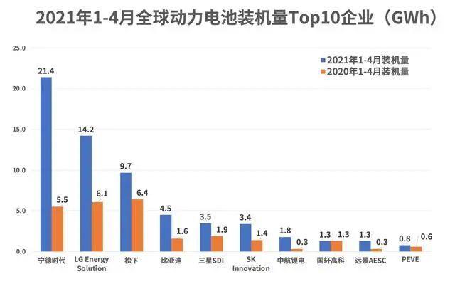 以寧德時(shí)代為例,利用產(chǎn)業(yè)鏈優(yōu)勢及特斯拉、蔚來等“大批量”的合作網(wǎng)絡(luò),作為龍頭企業(yè)的寧德時(shí)代從去年年底便形成了對LG Energy Solution和松下等反超。今年前四個(gè)月來看,這樣的領(lǐng)先優(yōu)勢仍不斷擴(kuò)大。