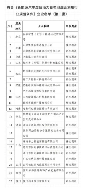 工信部于2018年7月公布第一批5家,包括華友、豪鵬科技、格林美、邦普循環(huán)、光華科技;2021年1月,工信部第二批入圍白名單的共計22家,深圳深汕特別合作區(qū)乾泰技術有限公司入列。
