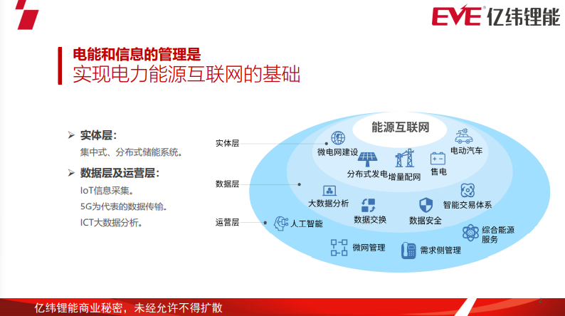 首先從實體層來講,大家都非常熟悉的集中式或者分布式的儲能系統(tǒng)、新能源汽車,都是能源互聯網的一些實體應用。在數據層、運營層,涵蓋了用能信息的采集、傳輸以及平臺的大數據分析。