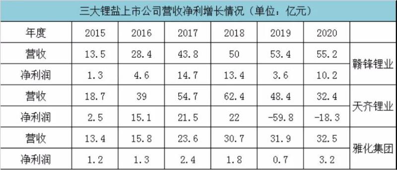 受此影響,鋰鹽三巨頭營收凈利出現(xiàn)明顯改善。贛鋒鋰業(yè)2020年凈利潤達(dá)10.2億元,同比增加6.6億元;雅化集團(tuán)凈利潤增加2.5億至3.2億元;天齊鋰業(yè)凈利潤依然虧損18.3億元,但同比2019年的-59.8億元實(shí)現(xiàn)虧損收窄。