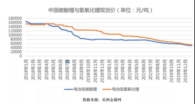 從2018年4月開始,國內(nèi)碳酸鋰價格大幅下降,從年初最高價16萬元/噸一路跌至年底7萬元/噸左右。進(jìn)入2019年,碳酸鋰價格繼續(xù)下行,年底市場均價約4.8-5.1萬元/噸左右。