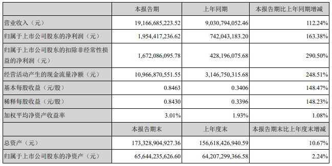 4月29日晚,寧德時(shí)代發(fā)布2021年第一季度報(bào)告。報(bào)告顯示,寧德時(shí)代一季度實(shí)現(xiàn)營(yíng)業(yè)收入191.67億元,同比增長(zhǎng)112.24%;歸屬于上市公司股東的凈利潤(rùn)達(dá)19.54億元,同比增長(zhǎng)163.38%。