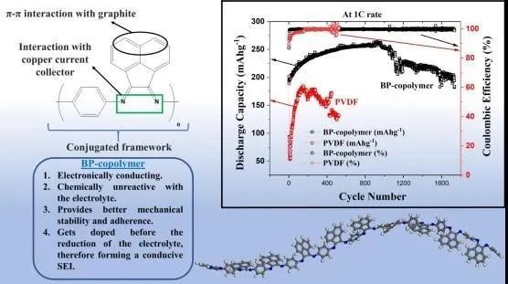 與傳統(tǒng)的PVDF粘合劑相比,BP粘合劑可為負極提供更好的粘合性和機械穩(wěn)定性。其次,BP共聚物相比PVD更具導電性,并可產(chǎn)生一個更薄、且電阻更小的導電固體電解質(zhì)界面。同時BP共聚物不容易與電解質(zhì)發(fā)生反應,大大避免降解。