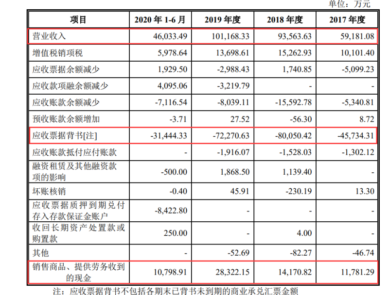 對于為何天力鋰能的營業(yè)收入與銷售商品、提供勞務收到的現金之間有如此巨大的差額,天力鋰能詳細披露了二者的勾稽關系,其中影響最大的因素為“應收票據背書”。2017年度至2019年度,天力鋰能的應收票據背書金額分別為4.57億元、8億元和7.23億元。