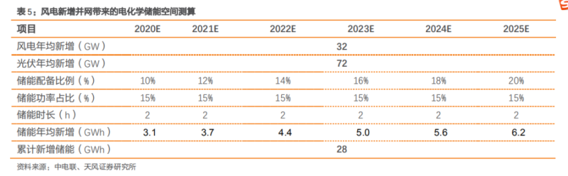 在能源結(jié)構(gòu)轉(zhuǎn)型,新能源裝機高增,各地政府要求配置儲能的背景下,我們對我國新能源并網(wǎng)帶來的儲能空間進行測算。預(yù)計 2020-2025 年間,風(fēng)電、光伏并網(wǎng)帶來的新增儲能需求合計為 28GWh,年均新增儲能需求為 4.7GWh。測算假設(shè):①新增裝機:根據(jù)表 3 的測算結(jié)果,假定 2020-2025 年,風(fēng)電光伏新增裝機呈線性增長,每年合計新增裝機規(guī)模 104GW;②儲能配比率:從 2020 年各地要求的儲能配比率來看,最低配比要求 5%,最高配比要求 20%。我們假定 2020 年實現(xiàn)配比率 10%,以后每年配比率逐漸上升 2pct,至 2025 年實現(xiàn)配比率 20%;③儲能功率占比:根據(jù)現(xiàn)有儲能項目功率配比情況,假設(shè)為 15%;④儲能時長:按 2h 的平均備電時長作為估算值。