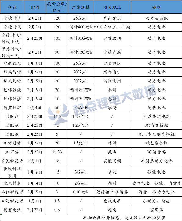 據(jù)起點(diǎn)鋰電大數(shù)據(jù)不完全統(tǒng)計(jì),截至3月5日,鋰電池領(lǐng)域投資擴(kuò)產(chǎn)項(xiàng)目已達(dá)到18起,涉及投資總額超過840億元,包括動力電池、消費(fèi)類電池、儲能電池等領(lǐng)域,預(yù)計(jì)將新增鋰電池產(chǎn)能超過200GWh。