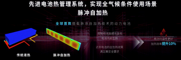 專用刀片電池“自發(fā)熱,不懼寒冬”的亮點同樣值得稱道,其采用的脈沖自加熱和冷媒直冷熱管理技術全球領先,實現(xiàn)全氣候條件使用場景。脈沖自加熱技術屬全球首創(chuàng),可通過電池高頻充放電達到提升電池溫度的目的,電芯自身發(fā)熱的均溫性更好,在寒冷的東北地區(qū)也可使用。