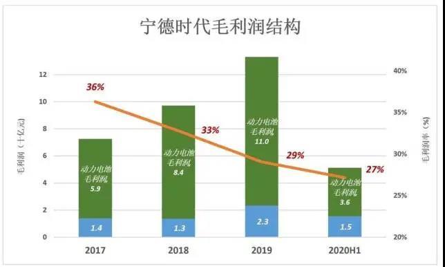 2017年寧德時代動力電池單價毛利潤為496元/KWh。2018年、2019年分別為357元、273元。