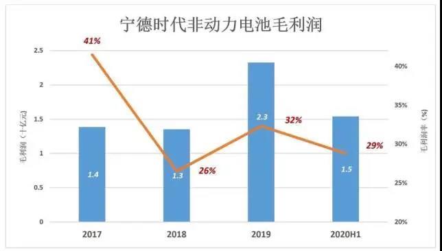 2019年,非動力電池業(yè)務(儲能、電池材料)毛利潤達23.3億、毛利潤率32%,比動力電池高4個百分點;2020年H1,非動力電池業(yè)務毛利潤達15.4億、毛利潤率29%,比動力電池高2個百分點。