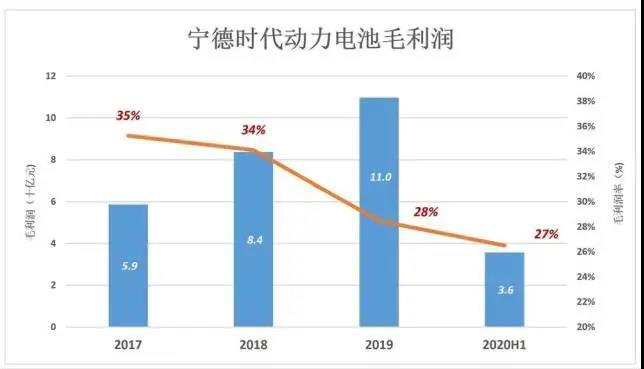 隨著銷售單價下降,寧德時代毛利潤率一路下滑,2018年還是34%、2019年跌到28%、2020年H1只有27%。但直到疫情發(fā)生前的2019年,寧德時代毛利潤一直保持著上漲勢頭,2017年59億、2018年84億、2019年110億。2020年H1,受疫情影響,寧德時代動力電池營收下降20.2%、毛利潤率下降2.4個百分點,毛利潤35.7億、同比下降26.8%。