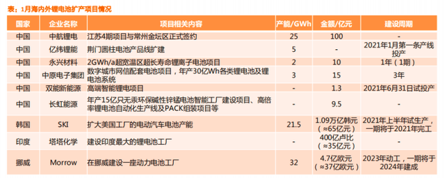 天風(fēng)證券鄒潤(rùn)芳團(tuán)隊(duì)2月1日?qǐng)?bào)告指出,從建設(shè)周期看,多數(shù)項(xiàng)目為分期建設(shè),首期項(xiàng)目多于2021年內(nèi)建成或試投產(chǎn),基本在2024年之前完全建成。從1月的擴(kuò)產(chǎn)項(xiàng)目可以看出,一方面目前頭部企業(yè)仍為擴(kuò)張主力,中航鋰電和億緯鋰能擴(kuò)產(chǎn)產(chǎn)能超過(guò)30GWh;另一方面,海外企業(yè)正在加速追趕,產(chǎn)能規(guī)模加大。