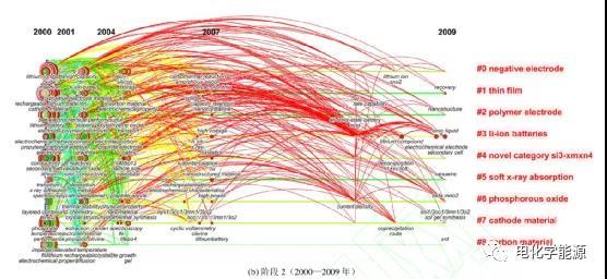 鋰離子二次電池仍然是研究的主體,與階段 1 相比,增加了許多其它出現(xiàn)強度較高的關(guān)鍵詞,例如:new layered cathode material,graphite particles, electrodeposited Sn-Ni alloy film, high capacity anode material, Silicon-based insertion anodes, camphor-pyrolysed carbon electrode, particle size; carbon nanotube, microstructure,cycle stability, new layered cathode material, mobile phones, negative electrode , carbon fiber , thermosetting resin , nano-Si anode , graphite particle size , heavy metal characterization ,mobile phone, carbon nanotube 等。從聚類中的關(guān)鍵詞可以看出,正極、負極材料仍然是研究的熱點。由于聚合物鋰離子具有安全性能好、薄、重量輕、容量大的優(yōu)點,這類材料成為研究的新熱點。對第 2 階段的關(guān)鍵詞進行突發(fā)性檢測,關(guān)鍵詞的突發(fā)性檢測反映了這類關(guān)鍵詞頻次突然上升,體現(xiàn)研究的熱點。此階段發(fā)現(xiàn)了 LiMn2O4, LiNiO2,LixCoO2,dioxide,lithium intercalation(嵌鋰)等 26 個突現(xiàn)關(guān)鍵詞,延續(xù)了上一階段的研究熱點,鋰的氧化物研究仍然比較多,并且類型更加豐富。納米管(nanotube)、納米顆粒(nanoparticle)、納米結(jié)構(gòu)(nanostructure)這類與納米有關(guān)的關(guān)鍵詞的突現(xiàn)強度在短短 5 年內(nèi)達到較大的值, Si 基負極材料(novel category Si3-xMxN4)、碳負極材料(carbon material)、碳纖維(carbon fiber)負極料出現(xiàn)頻次多。說明利用納米材料或是借助于納米方法研究二次電池成為后續(xù)研究新的熱點,從第 3 階段的發(fā)文量可以反映出,以崔屹教授為代表,開始研究 Si nanowire 高能量密度鋰電池負極材料,他們針對高能量密度電極材料在循環(huán)中面臨的結(jié)構(gòu)穩(wěn)定性差的問題,制備結(jié)構(gòu)穩(wěn)定性好的納米材料,尤其是對鋰二次電池中極具潛力的硅負極(理論比容量高達 4200 mAh g-1)進行了深層次的研究。納米材料在解決高能量密度電極材料的巨大優(yōu)勢引起較高的關(guān)注。