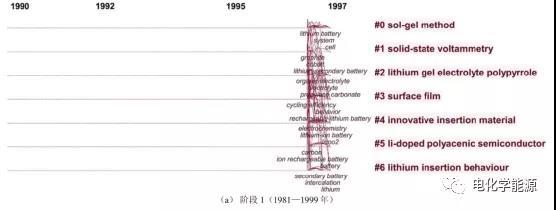 鋰二次電池研究采用的溶膠-凝膠方法(溶膠凝膠法制備錳酸鋰/鈷酸鋰正極材料)在第 2 階段發(fā)生了突現(xiàn),在第 3 階段,研究方法 spray pyrolysis 發(fā)生突現(xiàn),說明該方法應(yīng)用較多。