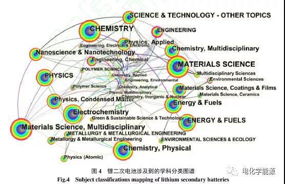 (2) 從學(xué)科分類來看,鋰二次電池研究涉及到的領(lǐng)域廣泛且學(xué)科之間的聯(lián)系密切。如化學(xué)、電化學(xué)、物理、能源、材料科學(xué)、工程技術(shù)等。尤其是在能源、環(huán)境等領(lǐng)域受到高度關(guān)注。