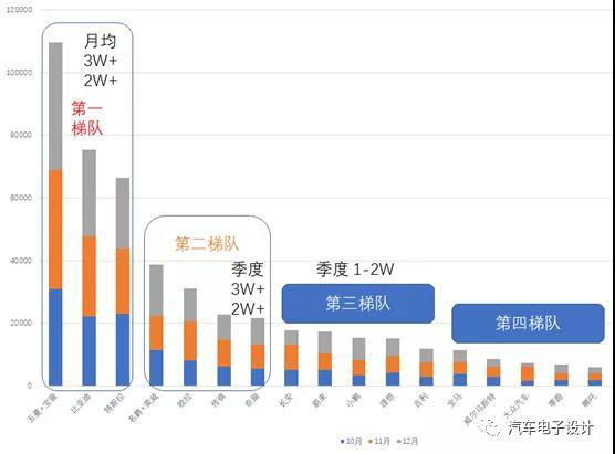 從整車(chē)來(lái)看,目前已經(jīng)衍生出來(lái)幾個(gè)梯隊(duì),按照產(chǎn)量的數(shù)據(jù)來(lái)排名,形成第一梯隊(duì)月產(chǎn)2萬(wàn)+,第二梯隊(duì)季產(chǎn)2萬(wàn)和季度產(chǎn)1.5萬(wàn)的三個(gè)梯隊(duì)。