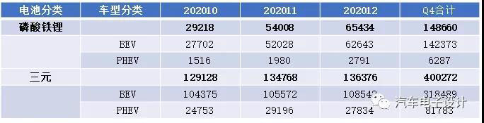 單從電池來(lái)看,我們可以發(fā)現(xiàn),磷酸鐵鋰目前在BEV里面的應(yīng)用非常快,目前12月達(dá)到了6.54萬(wàn)臺(tái),為三元13.63萬(wàn)臺(tái)的1/2不到一些。月度裝車(chē)的數(shù)量從10月的0.98GWh(14.7%)拉升到2.32GWh(28%)。相對(duì)而言三元電池的裝機(jī)臺(tái)數(shù)比較平均,10月12.9萬(wàn)臺(tái)到12月也就13.63萬(wàn)臺(tái),裝車(chē)量卡在了6GWh左右。