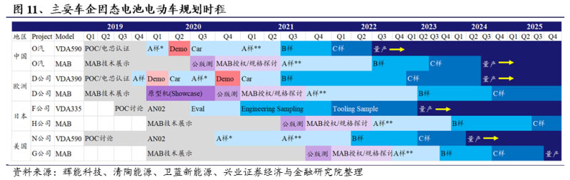 根據(jù)主要車(chē)企的規(guī)劃,搭載固態(tài)電池的產(chǎn)品預(yù)計(jì)最早于2022年以后量產(chǎn)。