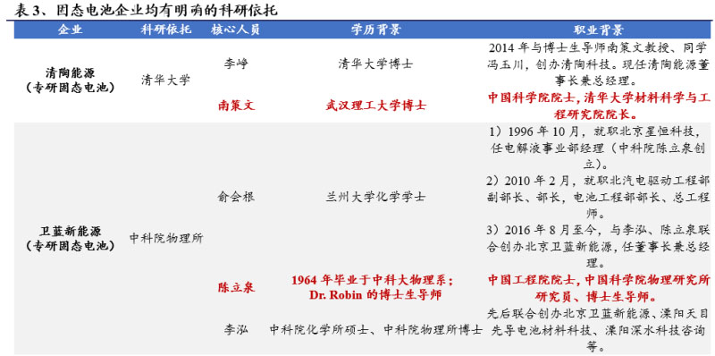 產(chǎn)-研融合屬性突出。清陶能源、衛(wèi)藍(lán)新能源、浙江鋒鋰、新宙邦、QuantumScape等企業(yè)的核心技術(shù)人員均來(lái)自清華大學(xué)、中科院、南科大、斯坦福等頂尖科研院所。