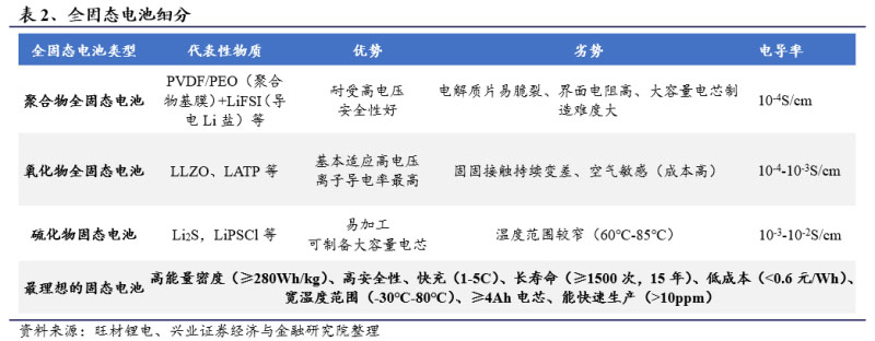 理想的全固態(tài)電池:高能量密度(≥280Wh/kg)、高安全性、高電導(dǎo)率(10-2S/cm)長(zhǎng)壽命(≥1500次,15年)、≥4Ah電芯、能快速生產(chǎn)(>10ppm);快充(3-5C)、低成本(<0.6元/Wh)、寬溫度范圍(-30℃-80℃)。但目前高電導(dǎo)率、長(zhǎng)壽命、快沖、低成本、寬工作溫度范圍都還未能實(shí)現(xiàn)。