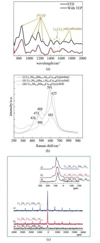 圖15 (a) LRO電極的FTIR圖像;(b) 循環(huán)前后對比的Li1.2Ni0.16Mn0.56Co0.08O2拉曼圖譜;(c) 鋁含量對NCM 523中鋁的局部結構影響的NMR圖譜