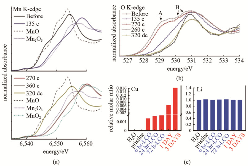 Wandt等用原位的XANES研究NCM為電池正極的鋰離子電池中的過渡金屬元素在工作時的溶解和沉積的問題。當電位超過4.6 V時,Mn的溶解速率迅速增加。在原位觀察時,無論充電狀態(tài)如何,石墨電極上沉積的Mn的價態(tài)始終為+2;然而同樣的電極之后再用非原位觀察卻發(fā)現了0價Mn的存在。說明即使在氬氣填充的手套箱中Mn2+還是不可避免地被還原了。