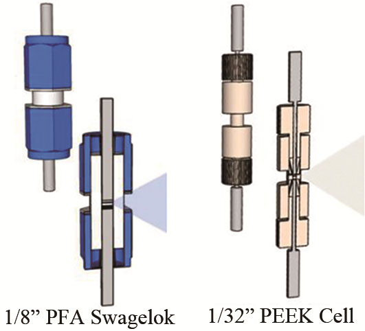 Raman散射常使用激光光源,為保證原位觀測窗口的穩(wěn)定,其材料多為耐熱玻璃或石英。FTIR有兩種主要的電池設計,分別是具有內部(電解質層較厚)和外部(電解質層較薄)反射配置的單元。