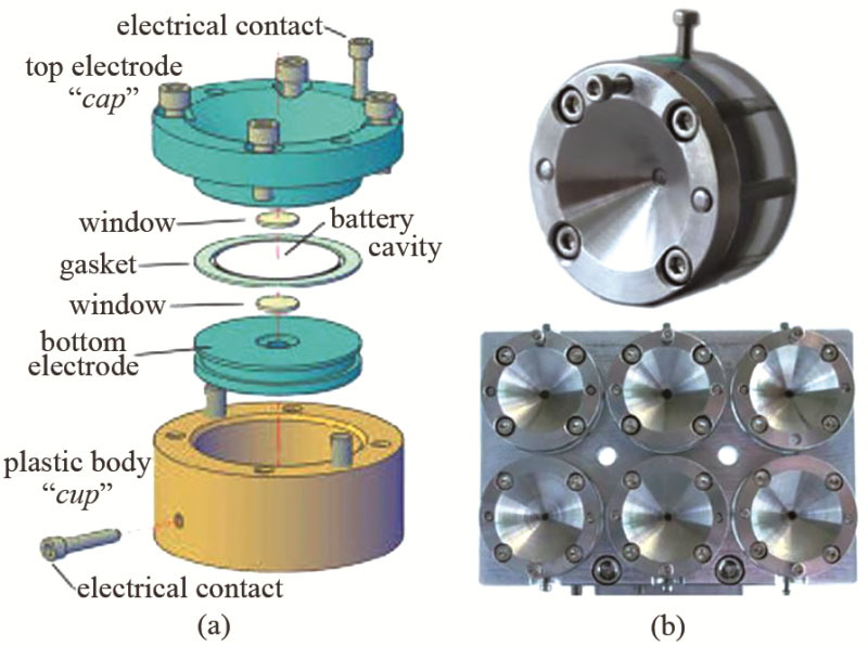 對原位X射線檢測技術而言,實驗用的電池需要一個窗口使X射線通過,這就需要特殊構型的電池。但電池設計考慮表征時也要盡可能減少對電池反應的不利影響,電池堆疊不緊密或者窗口透射X射線導致電導率差都會影響電池反應。阿貢國家實驗室的Borkiewicz等設計了一種AMPIX電池(圖8),能在不影響電池運行的情況下允許多種X射線表征,包括XRD和XAS等表征技術。電池裝置幾個主要部件包括杯形主體、位于頂部和底部電極、X射線窗口和一個扁平的環(huán)形墊圈。