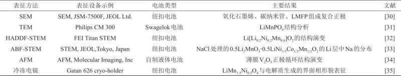 在對鋰離子電池的正極材料的研究中,顯微成像方法主要被用于觀察正極脫嵌鋰前后、循環(huán)過程中和包覆以及摻雜帶來的形貌以及微觀結構的變化。研究中主要使用的顯微成像方法有SEM、TEM、STEM、STM、AFM、掃描透射X射線顯微鏡(STXM)以及同步透射X射線顯微鏡(TXM)。表1列舉了近年一些研究中的顯微成像表征工作。