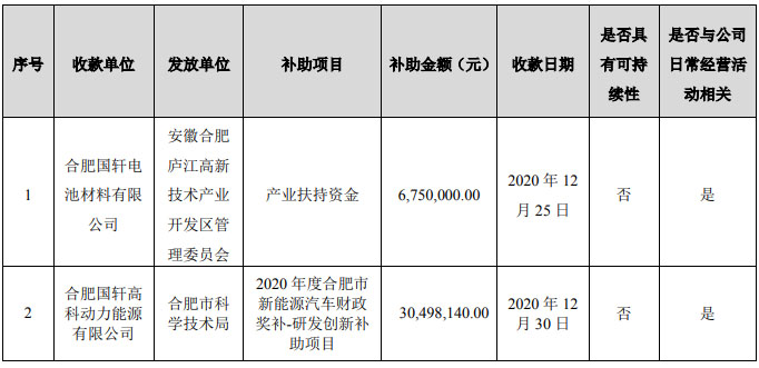 1月7日晚,國(guó)軒高科發(fā)布公告稱(chēng),公司子公司2020年10-12月份累計(jì)收到與收益相關(guān)政府補(bǔ)助資金合計(jì)人民幣4840.53萬(wàn)元,具體如下: