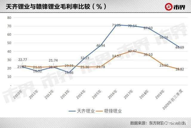 既掌握上游資源,又有強(qiáng)大生產(chǎn)線做支撐,天齊鋰業(yè)由一個(gè)鋰產(chǎn)品加工商,搖身一變成為了“礦主”。公司毛利率迅速提升,并反超競(jìng)爭(zhēng)對(duì)手贛鋒鋰業(yè)。