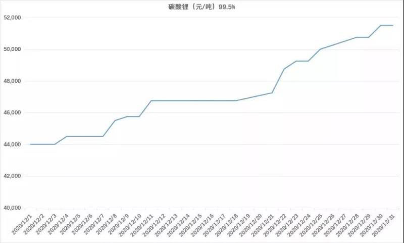 市場數(shù)據(jù)顯示,自10月起,國內(nèi)電池級碳酸鋰價格開始出現(xiàn)回調(diào)。截止2020年12月31日,電池級碳酸鋰均價上漲至51500元/噸,漲幅約30%,較12月1日上漲7500元/噸,反彈17%。