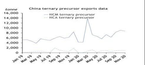 中國海關(guān)數(shù)據(jù)顯示,2020年1-11月國內(nèi)NCM三元前驅(qū)體出口達81649噸,同比增長37.2%;同期NCA前驅(qū)體的出口量增長了1.4%,達到6868噸。