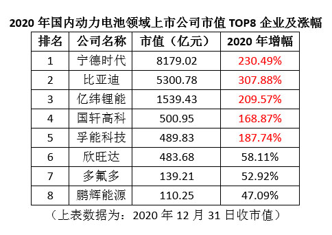 剛剛走過的2020年,見證了全球新能源汽車,尤其是動(dòng)力電池產(chǎn)業(yè)的爆發(fā)式增長。這一年,電動(dòng)汽車領(lǐng)跑品牌特斯拉,市值屢創(chuàng)新高,坐穩(wěn)全球新能源領(lǐng)域車企市值龍頭。同樣是這一年,在中國資本市場,寧德時(shí)代、比亞迪、億緯鋰能、國軒高科、贛鋒鋰業(yè)、恩捷股份、天賜材料等數(shù)十家動(dòng)力電池產(chǎn)業(yè)鏈上市公司,市值也紛紛創(chuàng)下新紀(jì)錄,并且還有望繼續(xù)刷新紀(jì)錄。