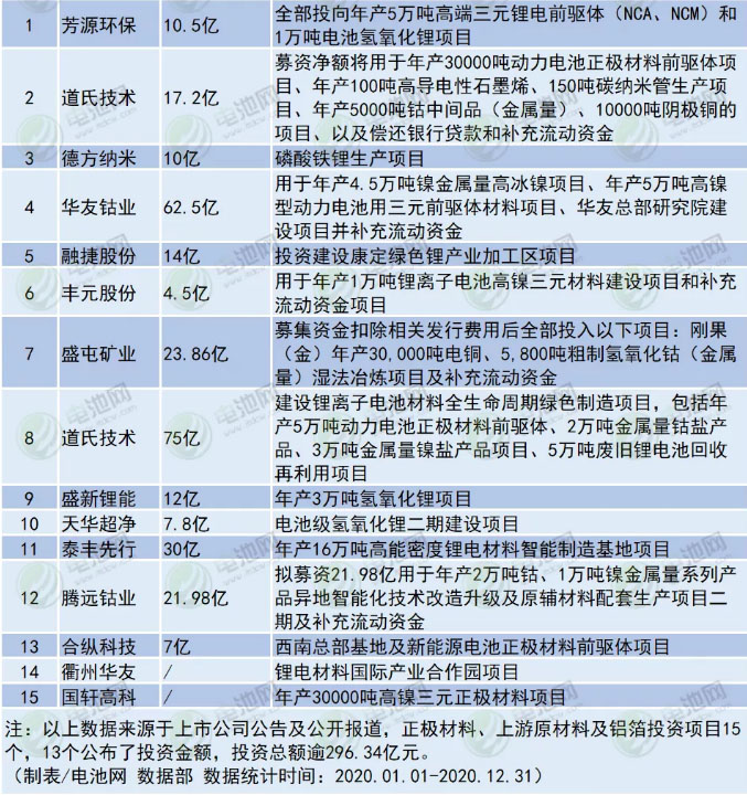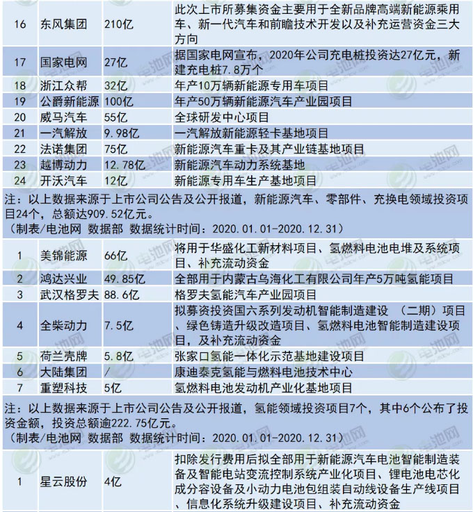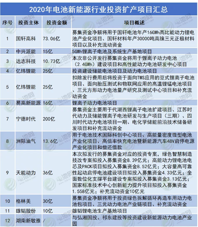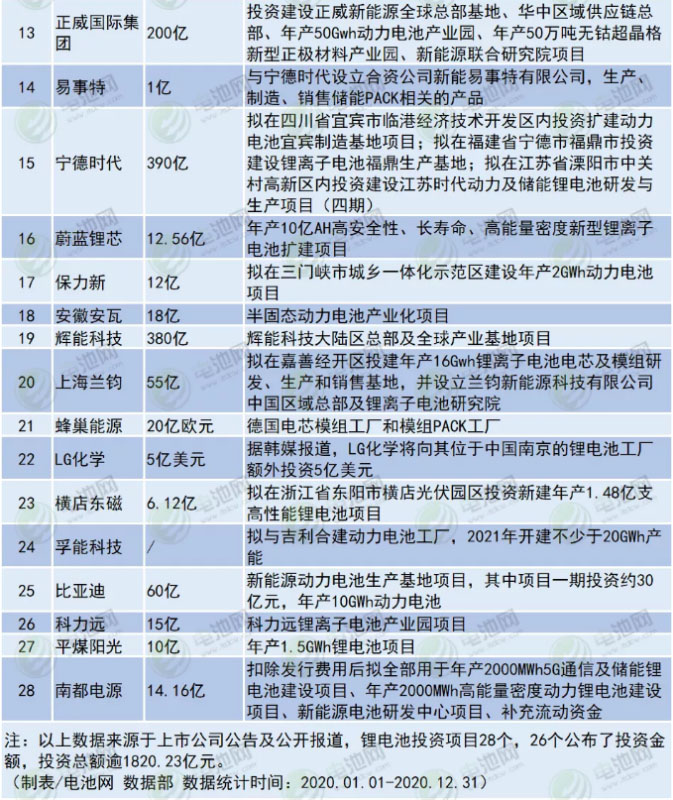根據(jù)上市公司公告及公開報(bào)道,電池網(wǎng)統(tǒng)計(jì)了2020年電池新能源產(chǎn)業(yè)鏈投資擴(kuò)產(chǎn)項(xiàng)目相關(guān)情況,統(tǒng)計(jì)在內(nèi)的103個(gè)項(xiàng)目,97個(gè)公布投資金額,投資總額逾3737.52億元。其中,鋰電池投資項(xiàng)目28個(gè),26個(gè)公布了投資金額,投資總額逾1820.23億元;正極材料、上游原材料及鋁箔投資項(xiàng)目15個(gè),13個(gè)公布了投資金額,投資總額逾296.34億元;負(fù)極材料及銅箔投資項(xiàng)目8個(gè),其中7個(gè)公布了投資金額,投資總額約254.01億元;隔膜投資項(xiàng)目5個(gè),投資總額約81.08億元;電解液投資項(xiàng)目7個(gè),投資總額達(dá)61.77億元;新能源汽車、零部件、充換電領(lǐng)域投資項(xiàng)目24個(gè),總額達(dá)909.52億元;氫能領(lǐng)域投資項(xiàng)目7個(gè),其中6個(gè)公布了投資金額,投資總額逾222.75億元;鋰電設(shè)備及其他領(lǐng)域投資項(xiàng)目9個(gè),投資總額逾91.82億元。