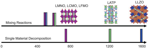 圖4 不同尖晶石型正極材料與LATP, LLZO固態(tài)電解質的分解溫度以及兩兩混合后的分解溫度示意圖