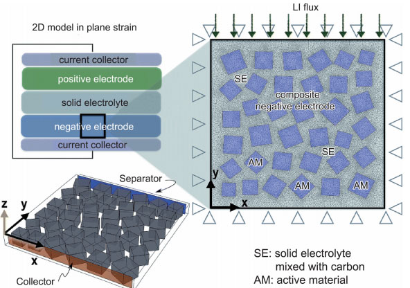 圖3 正極材料有限元模型的幾何、離散化和邊界條件示意圖。電極材料顆粒嵌入了固態(tài)電解質和電子導電劑顆粒中