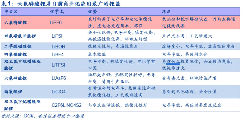 六氟磷酸鋰是電解液的重要組成部分,短中期內可替代性低。電解液由高純溶質、溶劑和高純添加劑按照一定的比例配制而成,其核心競爭力在于工藝控制和配方。由于六氟磷酸鋰在導電率、穩(wěn)定性和環(huán)保上的優(yōu)勢,能夠顯著影響電解液的離子電導率、電化學穩(wěn)定窗口、高低溫穩(wěn)定性和氧化穩(wěn)定性等重要性能,因此目前被作為商業(yè)化應用最廣的鋰鹽,在短中期內可替代性較低,傳統(tǒng)鋰鹽高氯酸鋰、六氟砷酸鋰等,均存在難以克服的性能缺陷,難以實現(xiàn)大規(guī)模商業(yè)化應用。新型鋰鹽中雙氟磺酰亞胺鋰電導率、穩(wěn)定性、高低溫性能等均較為理想,是最具商業(yè)化應用前景的鋰鹽,但是其加工難度較大,成本和價格較高,對電解液及鋰電池成本影響較大,尚難以實現(xiàn)大規(guī)模量產和應用,目前主要作為添加劑少量使用。
