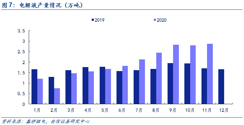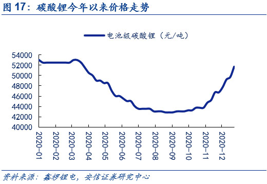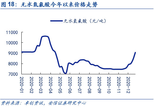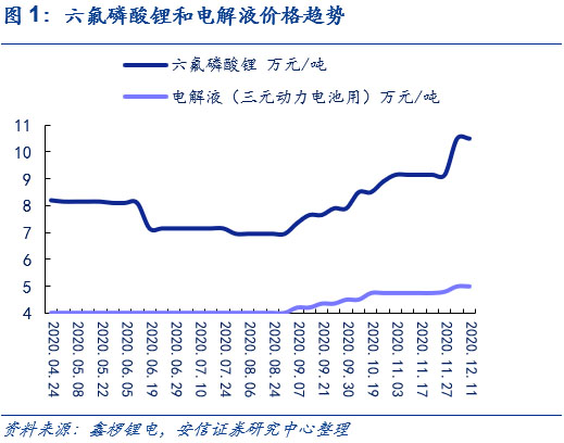 下游需求景氣疊加冬季原料供應偏緊,短期內碳酸鋰和無水氫氟酸價格均底部上行。在新能源車下半年景氣度提升的情況下,用于生產新能源車電池電解液鋰鹽六氟磷酸鋰的碳酸鋰和無水氫氟酸的需求持續(xù)增長(其中碳酸鋰還被用于生產正極磷酸鐵鋰)。而在供給端,由于冬季氣溫驟降,且2020年較往年溫度更低,碳酸鋰上游包括青海在內的多個鹽湖的鋰企下調產量預期。與此同時,無水氫氟酸上游螢石粉價格因冬季的來臨,市場貨源也逐步減少。供不應求的局面使得原料成本上漲,在下游需求景氣的情況下,推動碳酸鋰和無水氫氟酸價格底部上行。