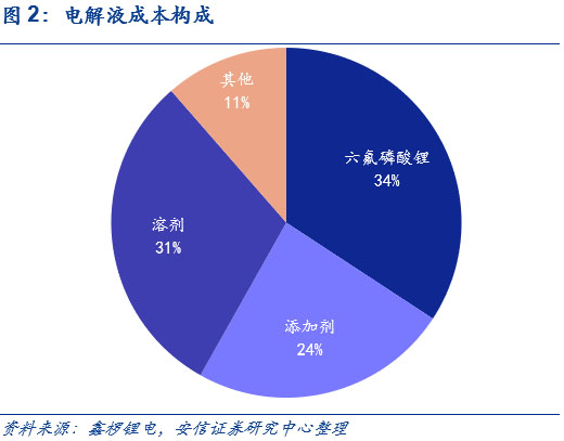 六氟磷酸鋰在電解液成本中占比較高,價格變動影響電解液價格走勢。電解液原材料成本占據(jù)較大比重,其中原材料主要由溶劑、添加劑和鋰鹽構成,鋰鹽目前以六氟磷酸鋰為主。從電解液的成本來看,根據(jù)鑫欏鋰電近期的價格統(tǒng)計,結合電解液的材料用量測算,以最新的價格來看,六氟磷酸鋰目前在電解液的成本構成中超30%;由于成本占比較高,六氟磷酸鋰的價格變動也顯著影響電解液的價格走勢。