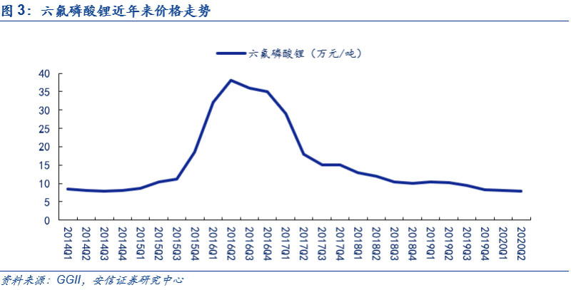 回顧過往,六氟磷酸鋰價格周期性明顯,2020年上半年仍處在價格底部。自2011年六氟磷酸鋰實現(xiàn)國產化后,由于第一輪擴產,疊加需求尚未大規(guī)模啟動,導致供過于求,價格長期低于10萬元/噸;2015年以來新能源車的發(fā)展帶動六氟磷酸鋰需求大增,短期內新增產能無法彌補高速增長的需求,根據(jù)GGII數(shù)據(jù),價格由2015年第三季度的10萬元/噸上漲至2016年二季度的38萬元/噸,漲幅高達280%;但在此后,由于需求端漲幅縮窄,疊加供給端新產能投放,到2017年第四季度,六氟磷酸鋰價格快速下滑,跌至15萬元/噸;進入2018年后,價格下滑速度放緩,進入9.5-11萬元/噸的區(qū)間;由于2019年新能源汽車銷量和2018年持平,六氟磷酸鋰的需求沒有增長,而此前新投產產能過多,行業(yè)仍然供大于求,疊加主要原材料碳酸鋰價格持續(xù)下跌,六氟磷酸鋰價格仍處于陰跌的通道中,到2020年8月份,六氟磷酸鋰行業(yè)價格最低處于均價不到7萬元/噸,處于歷史價格底部。
