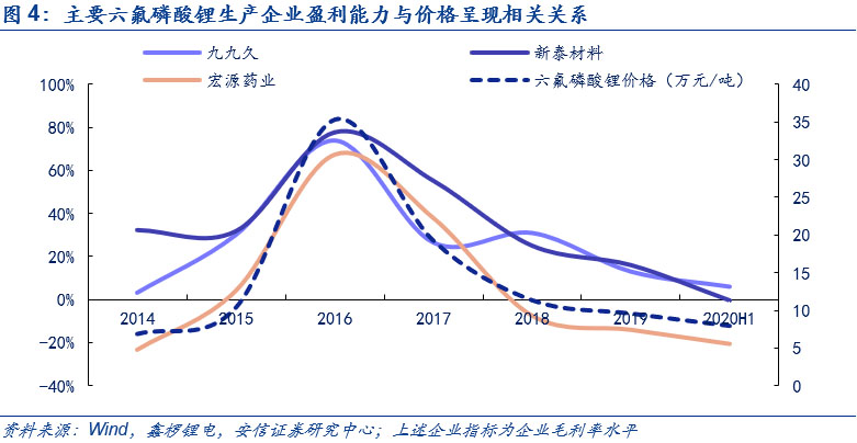 行業(yè)內主要企業(yè)盈利能力仍處于周期底部,漲價訴求強烈。六氟磷酸鋰價格與行業(yè)內企業(yè)盈利能力呈現(xiàn)明顯的正相關關系,當以行業(yè)主要企業(yè)包括九九久、新泰材料和宏源藥業(yè)等進行回溯時,截至2020年上半年,六氟磷酸鋰均價已接近歷史低位,相應地,行業(yè)內主要的生產六氟磷酸鋰的企業(yè)盈利能力也處在較低水平,在下半年需求顯著回暖的前提下,預計相關企業(yè)具有漲價訴求。