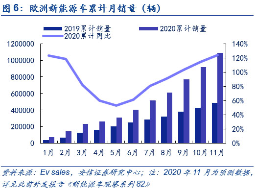 下半年需求端高增長帶來漲價契機。中國來看,累計數(shù)據(jù)上來看, 2020年1-11月,國內新能源汽車產銷分別為111.9萬輛和110.9萬輛,同比分別下降0.1%和增長3.9%,銷量實現(xiàn)由負轉正,上半年受到疫情影響產銷不及預期,但下半年在產品力持續(xù)驅動下產銷超預期增長。歐洲方面,盡管上半年在疫情影響下,歐洲新能源車銷量實現(xiàn)了V字走勢,但自下半年以來,碳排放的倒逼和各國電動化政策的加碼助推新能源車銷量持續(xù)上行。全球新能源車市下半年以來的持續(xù)高增長已為上游的電解液和六氟磷酸鋰帶來漲價契機。