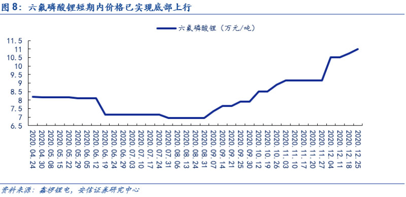 六氟磷酸鋰短期內價格已底部上行。在下半年新能源車需求端顯著回暖和電解液的需求大幅度增長的情況下,帶動了六氟磷酸鋰需求增長,疊加原材料碳酸鋰價格上探,推動六氟磷酸鋰企業(yè)議價權增加。在此基礎上,六氟磷酸鋰短期價格已實現(xiàn)底部上行。根據(jù)鑫欏鋰電,目前圣誕節(jié)前后六氟磷酸鋰的市場價格已經增長到了11萬元/噸。