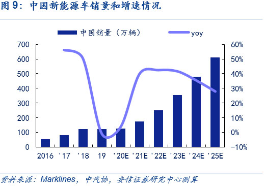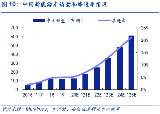 中國方面,產品驅動推動中國新能源車市場,2025年銷售量將超600萬輛,6年CAGR達31%。目前,中國市場正從政策驅動逐步轉向產品驅動,結合Marklines和中汽協(xié)的相關預測,考慮到大眾、奔馳和通用為首的傳統(tǒng)車企平臺化車型持續(xù)布局、造車新勢力顛覆傳統(tǒng)的產品驅動力持續(xù)發(fā)酵和特斯拉Model Y等產品在未來的潛在爆款效應,以2019年為基年,我們預計中國今年全年新能源車銷量約125萬輛;明年銷量近180萬輛,同比增長超40%;2025年達611萬輛,6年CAGR達31%,2025年新能源車滲透率超20%,測算過程可參見此前外發(fā)周報《歐洲電車逆勢增長超預期,中國產品力驅動持續(xù)凸顯》。