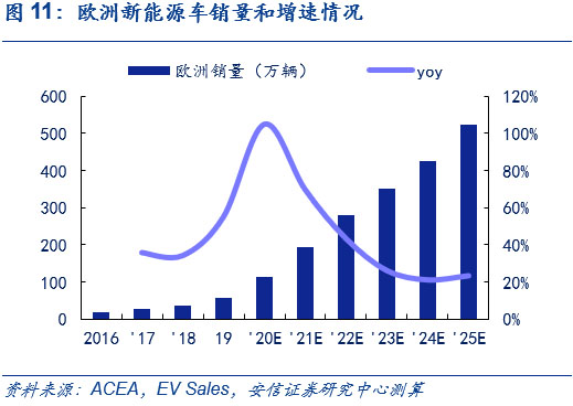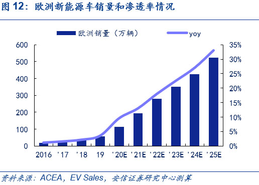 歐洲方面,預計歐洲電動車高增長態(tài)勢將持續(xù),2025年銷售量將超500萬輛,6年CAGR達45%。目前,在歐洲碳排放法規(guī)的倒逼和高補貼政策的推動下,新能源車在今年快速發(fā)展,結合ACEA和Ev Sales的相關預測,考慮到歐洲對于新能源車的高補貼政策將在近年來延續(xù)、大眾、奔馳為首的傳統(tǒng)車企平臺化車型持續(xù)布局和特斯拉歐洲工廠的建立,以2019年為基年,我們預計歐洲今年全年新能源車銷量近120萬輛;明年銷量將近190萬輛,同比增長近70%;2025年達520萬輛,6年CAGR達45%,2025年新能源摻和滲透率超30%,測算過程可參見此前外發(fā)周報《歐洲電車逆勢增長超預期,中國產品力驅動持續(xù)凸顯》。