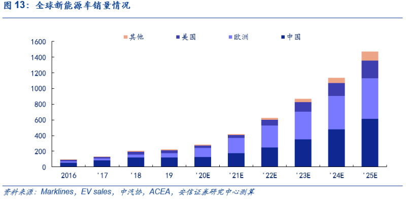 主要市場引領下,電動化大勢所趨,2025年全球新能源車銷售量近1500萬輛,6年CAGR達37%。目前,全球新能源車在中國、歐洲和美國為首的市場高速發(fā)展,未來五年,在不同國家多因素驅動的背景下,結合此前我們對中歐等地區(qū)的預測,以2019年為基年,我們預計全球2025年新能源車銷量達1468萬輛,6年CAGR達37%,2025年新能源車滲透率超15%,測算過程可參見此前外發(fā)周報《歐洲電車逆勢增長超預期,中國產品力驅動持續(xù)凸顯》。
