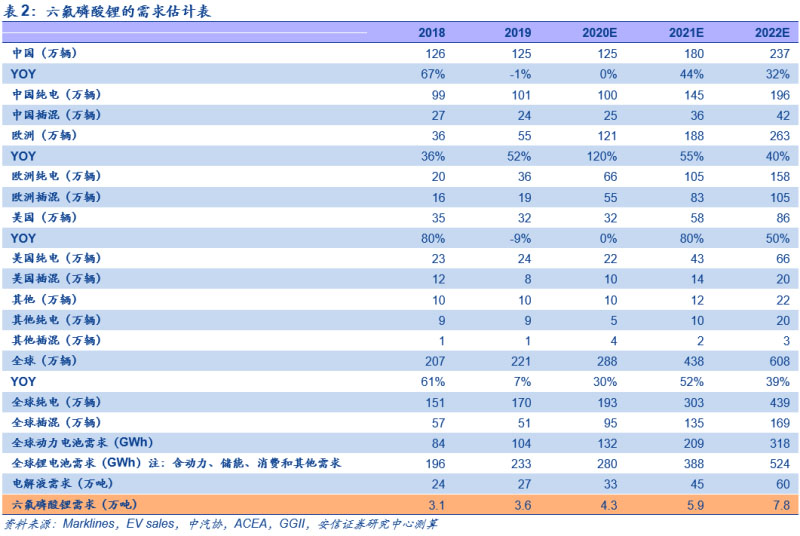 預計明后年六氟磷酸鋰需求分別為5.9/7.8萬噸,同比分別增長38%/33%。根據(jù)我們的測算,我們預計2020年全球新能源汽車銷量合計280萬輛,其中中國125萬輛,美國32萬輛,歐洲121萬輛,對應動力電池需求132GWh;疊加儲能、消費和其他需求;我們預計2020年全球鋰電池需求量合計280GWh。根據(jù)行業(yè)一噸電解液需要0.13噸六氟磷酸鋰的估計,可得出六氟磷酸鋰的需求量為4.3萬噸。而從中期來看,明后年六氟磷酸鋰需求分別為5.9/7.8萬噸,同比分別增長38%/33%。