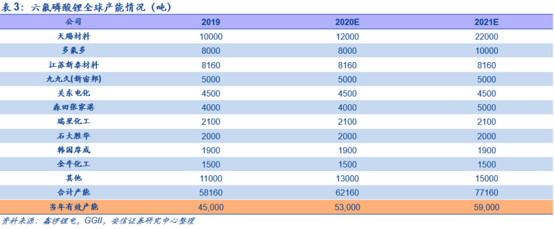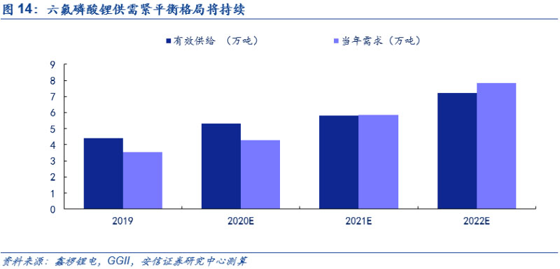 中期新增供給有限。自2016-2017年行業(yè)投產高峰期之后,行業(yè)新增產能投產速度明顯放緩,其中產能擴產以國內企業(yè)為主。目前僅有多氟多和天賜材料有顯著的擴產計劃,其中多氟多將在2021年擴產2000噸,天賜材料有3萬噸的液態(tài)六氟擴產計劃,按照公告和建設進程,預計其中1萬噸預計將在明年四季度轉固,疊加青海聚之源投產的2000噸,2020-2022年預計形成名義產能6.2/7.7/9.6萬噸。但由于投產時間點不同及產能爬坡有一定周期,且原有產能有部分為老產線,有化工檢修等方面的需要,疊加部分小廠在虧損情況下關停產線,從目前來看,預計2020-2022年有效產能分別為5.3/5.9/7.2萬噸。