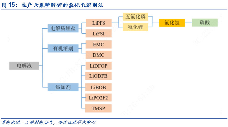 按照目前運用得最廣泛的氟化氫溶劑法來看,氟化氫溶劑法是將鹵化鋰溶解在無水氟化氫中,再通入高純PF5氣體進行反應,生成六氟磷酸鉀晶體,再經過分離、干燥得到六氟磷酸鋰產品。其中,以多氟多為例,六氟磷酸鋰的主要原材料為無水氫氟酸、碳酸鋰和五氯化磷。整體來看,對于原材料純度要求較高,且制備過程的安全生產控制難、對于無水環(huán)境要求高。